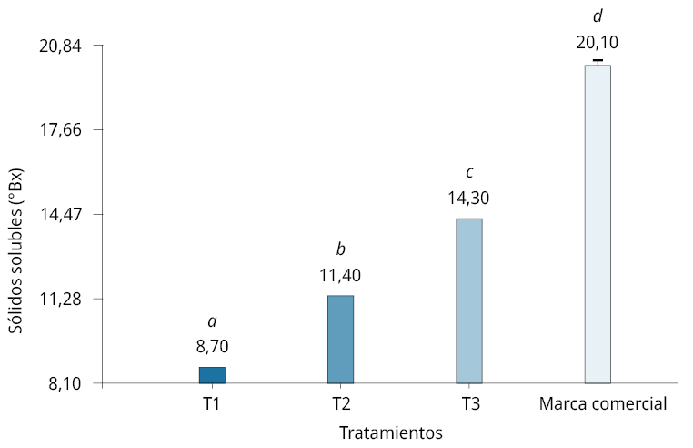 Figura 2. Resultados obtenidos en la variable sólidos solubles. Letras diferentes representan diferencias significativas (p < 0,05) ± Desviación estándar.