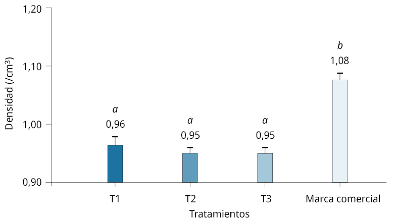 Figura 4. Resultados obtenidos en la variable densidad. Letras diferentes representan diferencias significativas (p < 0,05) ± Desviación estándar.