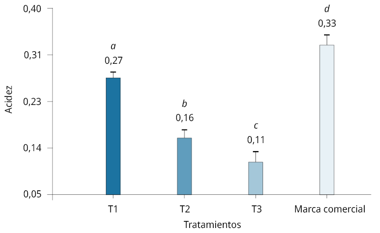 Con relación al contenido de acidez de las muestras se situaron entre 0,11 y 0,33, evidenciándose que a menor concentración (T1), la acidez fue mayor, es decir que la concentración del solvente sí influyó (Figura 3). Sin embargo, con respecto al tratamiento de la marca comercial, fue el que presentó una mayor acidez. Es necesario mencionar que la acidez cumple un rol importante en las características sensoriales de los alimentos (Qiu 2023).