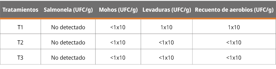 Los resultados de análisis microbiológicos arrojaron que en 25 g de cada muestra no hubo presencia de Salmonella spp. En el caso de mohos y levaduras, los tratamientos 2 y 3 presentaron < 1x10 ufc/g, mientras que el T1 mostró 1x10 ufc/g. Con ello se demuestra que los extractos analizados cumplen con los requisitos de calidad establecidos en la norma Draft Tanzanian Standard TZS AFDC 05 (6194) (Tanzania Bureau of Standards, s.d.) para Salmonella spp, mohos y levaduras.