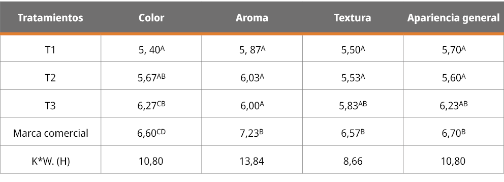 Los resultados obtenidos en la caracterización sensorial se presentan en la Tabla 2, donde se determinó que la marca comercial presentó mayor intensidad en las categorías analizadas. Mientras que los tratamientos T1, T2 y T3 difieren significativamente en el color, textura y apariencia general; en el aroma no se observaron diferencias en los extractos naturales. Sin embargo, autores como Clarensia et al. (2020) indican que los extractos naturales están constituidos por una gran variedad de compuestos que tienen un mayor potencial y por ende pueden brindar mejores características sensoriales a los alimentos, en especial con respecto al sabor.