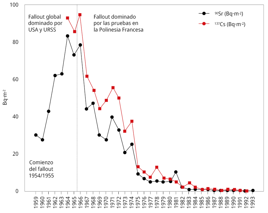 Más del 90% de la energía liberada por las pruebas nucleares atmosféricas (440 megatones) se concentró en el hemisferio norte, debido principalmente a los ensayos realizados por Estados Unidos en las Islas Marshall hasta 1958, y por la ex Unión Soviética entre 1961 y 1962 en Novaya Zemlya y Semipalatinsk (UNSCEAR, 2008). La firma del Tratado de Prohibición Parcial de Ensayos Nucleares, en 1963, redujo significativamente las emisiones globales de radionucleidos artificiales al poner fin a las pruebas atmosféricas de Estados Unidos, la URSS y el Reino Unido. Francia, por su parte, inició sus pruebas en el desierto del Sahara (1960–1966), trasladándolas posteriormente al Centro de Experimentación del Pacífico (C.E.P.) en la Polinesia Francesa, donde realizó 41 detonaciones atmosféricas entre 1966 y 1974. China también llevó a cabo pruebas en Lop Nor hasta 1980 (Chaboche et al., 2022).