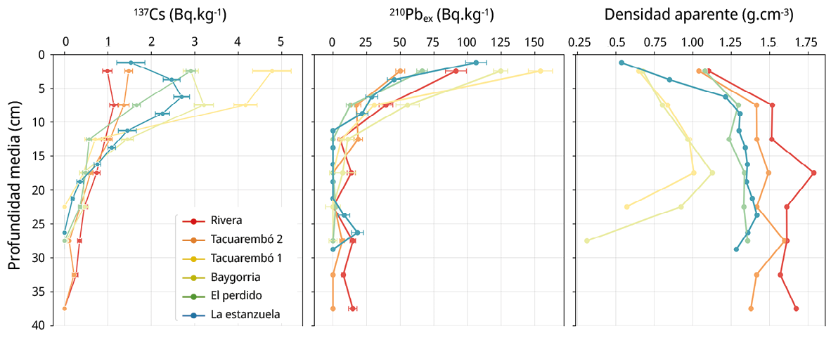 La Figura 2 muestra los perfiles de concentración (Bq·kg-1) en función de la profundidad para los radionucleidos 137Cs y 210Pbex. En el caso del 137Cs, se observa una mayor concentración en los primeros 10 cm del perfil del suelo, con valores máximos generalmente localizados entre los 5 y 10 cm de profundidad (rango: 1.0 a 4.5 Bq.kg-1). A partir de esa profundidad, las concentraciones disminuyen progresivamente hasta los 25–30 cm en la mayoría de los sitios, con excepción de ‘Tacuarembó 2’ y ‘Rivera’, donde se detecta actividad hasta los 35–40 cm.