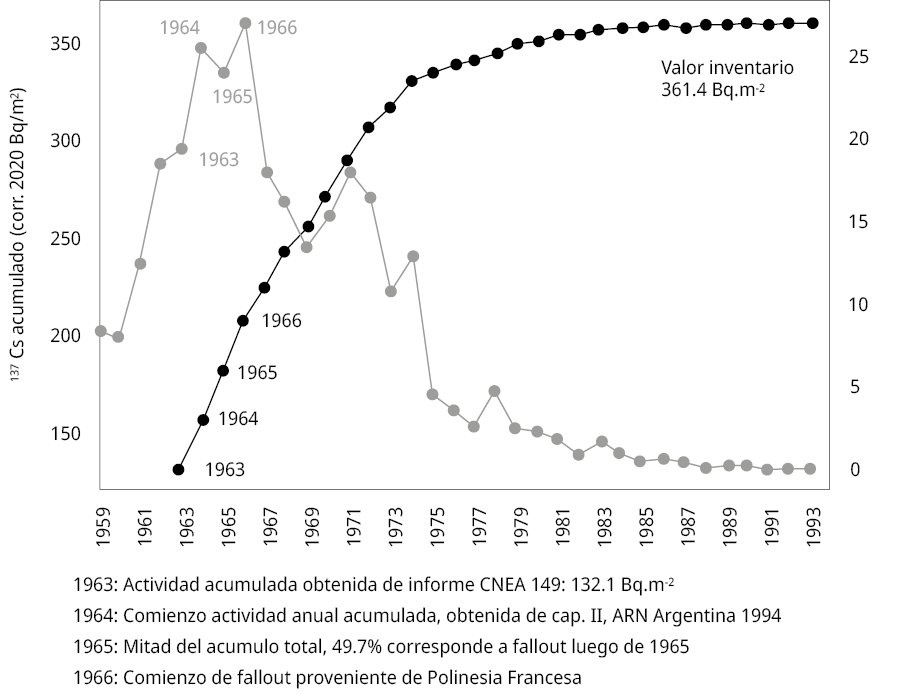 Figura 3. Acumulación y fallout anual de 137Cs en base a documentos históricos en Buenos Aires, corregido por decaimiento al 2020.