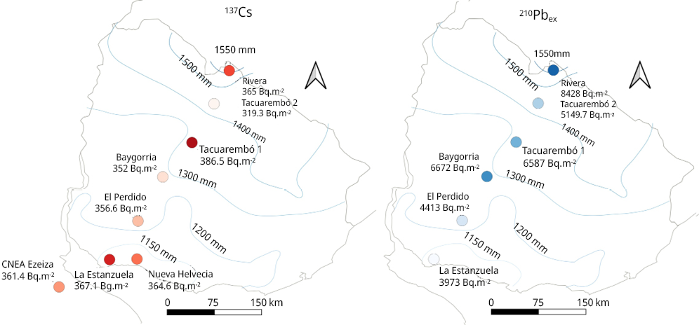 Resumen: Este trabajo caracteriza los niveles de inventario, concentración y distribución vertical de 137Cs y 210Pbex en suelos de referencia en Uruguay para establecer una línea base que soporte futuras investigaciones sobre erosión y vigilancia radiológica. Se estudiaron siete sitios distribuidos desde el sur (Colonia) hasta el norte (Rivera), cubriendo un gradiente climático representativo. Los inventarios de 137Cs resultaron homogéneos espacialmente (357,8 a 365,4 Bq.m-2), mostrando una alta concordancia con registros históricos de deposición atmosférica en Buenos Aires, lo que valida estos datos como referencia regional. Por el contrario, los inventarios de 210Pbex (3973 a 8428 Bq.m-2 en los primeros 15 cm) presentaron una fuerte correlación positiva con la precipitación media anual (R2 = 0,92, p = 0,01). Se concluye que los inventarios de 137Cs pueden considerarse estables y adecuados como referencia general para estudios de erosión, mientras que para 210Pbex, debido a su sensibilidad ambiental, es necesario determinar referencias locales específicas. Estos resultados aportan una línea base fundamental para evaluar cambios futuros en la contaminación radiológica regional derivada de eventos nucleares potenciales.