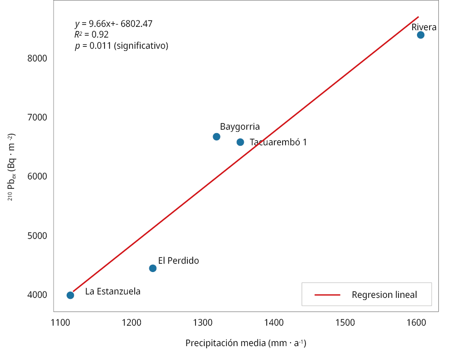 Por el contrario, los inventarios de 210Pbex mostraron una correlación positiva y significativa (p = 0.01) con el gradiente de precipitaciones medias anuales (R2 = 0.92), en concordancia con su mecanismo de deposición predominantemente asociado a eventos de precipitación local (Zhang et al., 2021). La alta sensibilidad del inventario de 210Pbex frente a variables ambientales como la precipitación impide establecer un valor único y representativo para todo el país. En consecuencia, se recomienda determinar el inventario de referencia a partir de muestras colectadas específicamente en la zona de estudio, a fin de asegurar la validez y precisión de las estimaciones en aplicaciones como la cuantificación de tasas de erosión.