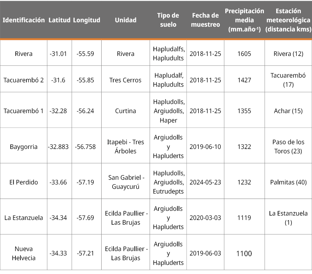 Tabla 1. Identificación, coordenadas, características del suelo según Soil Taxonomy (USA), fecha de muestreo y precipitaciones medias anuales en cada sitio.