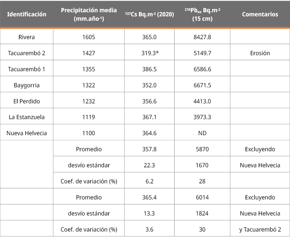 La Tabla 2 presenta los resultados de inventario (Bq.m-2) para cada sitio de muestreo. Para el cálculo del promedio, el desvío estándar y el coeficiente de variación, se excluyó la muestra correspondiente a “Nueva Helvecia”, con el fin de evitar un sesgo geográfico hacia el sur del país. En un segundo análisis, también se excluyó el sitio “Tacuarembó 2”, debido a evidencia de procesos de erosión del suelo, reflejados en un inventario de 137Cs significativamente inferior al promedio. Esta anomalía fue corroborada mediante la prueba de Dixon (p > 0.05, *).