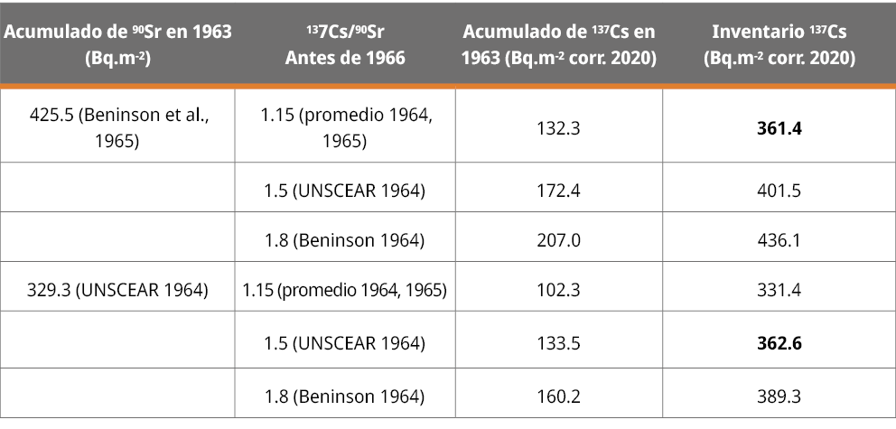 Para estimar la cantidad de 137Cs acumulada por fallout anterior a 1964, se utilizaron los valores acumulados de 90Sr reportados para 1963 en Buenos Aires, y se aplicó la relación 137Cs/90Sr, derivada tanto de fuentes bibliográficas como de reportes técnicos de la época, también se calcula en base a los datos de 1964 y 1965 tomados de ARN (Argentina. Presidencia de la Nación. Secretaría General. Autoridad Regulatoria Nuclear, 1994). Esta metodología permite una aproximación indirecta de la deposición histórica de 137Cs en ausencia de datos específicos medidos in situ previos a 1964.