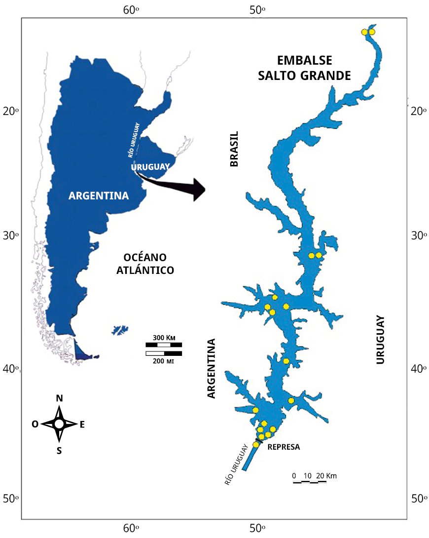 El presente trabajo se realizó en el embalse de Salto Grande, cuerpo de agua ubicado en el cauce principal del bajo río Uruguay (29°43′ a 31°12′S; 57°06′ a 57°55′W; Figura 1) en áreas próximas a la represa binacional de Salto Grande, a pocos kilómetros al norte de las ciudades de Concordia (Argentina) y Salto (Uruguay). Es un gran embalse tipo río subtropical, que se caracteriza por su forma alargada y su conexión directa con el cauce fluvial del río Uruguay, lo que influye en su dinámica hídrica y ecosistemas acuáticos asociados. Tiene una superficie de 750 km2, con su eje mayor en dirección NS de 144 km de longitud, una profundidad media de 6,4 m y profundidad máxima de 35 m, y un tiempo medio de retención de 11,3 días (Chalar, 2006; O’Farrell et al., 2012; Bordet et al., 2017).