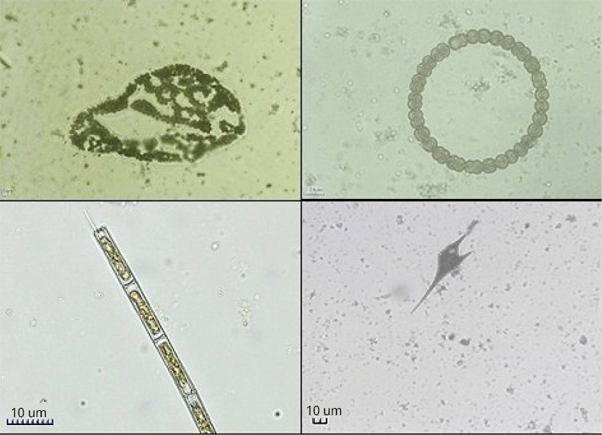 Figura 2. Imágenes de algunos organismos del fitoplancton formadores de floraciones en el embalse de Salto Grande. Microcysistis wesenbergii (10x), Dolichospermum circinale (10x); Aulacoseira granulata (10x) y Ceratium furcoides (10x).