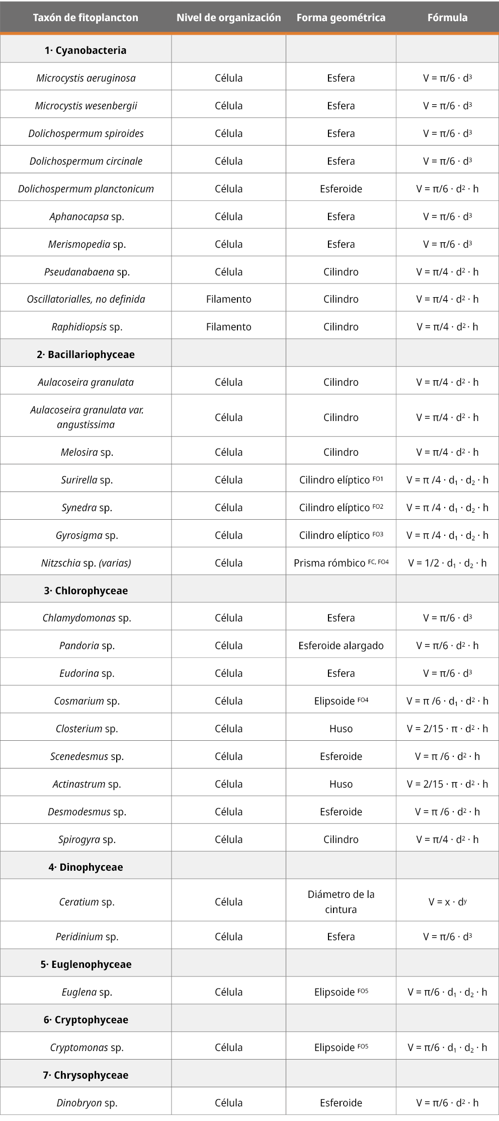Las estimaciones del biovolumen se realizaron a nivel celular, filamentoso y colonial, y para dichos cálculos se trabajó con 9 formas geométricas descritas por la Norma UNE-EN 16695:2016 (Asociación Española de Normalización y Certificación, 2016) en su Anexo A, de acuerdo con cada taxón (esfera, esferoide, cilindro, cilindro elíptico, prisma rómbico, esferoide alargado, huso, elipsoide y diámetro de la cintura para Ceratium) (Ver Tabla 1). Cuando una figura geométrica asignada no se ajustó al volumen efectivo, el resultado se multiplicó por un “factor de corrección” de la forma geométrica para estimar de modo preciso el volumen, en base a un listado de taxones establecidos con las formas geométricas, factor de corrección y factor de dimensión oculta (Napiórkowska-Krzebietke y Kobos, 2016; Asociación Española de Normalización y Certificación, 2016).