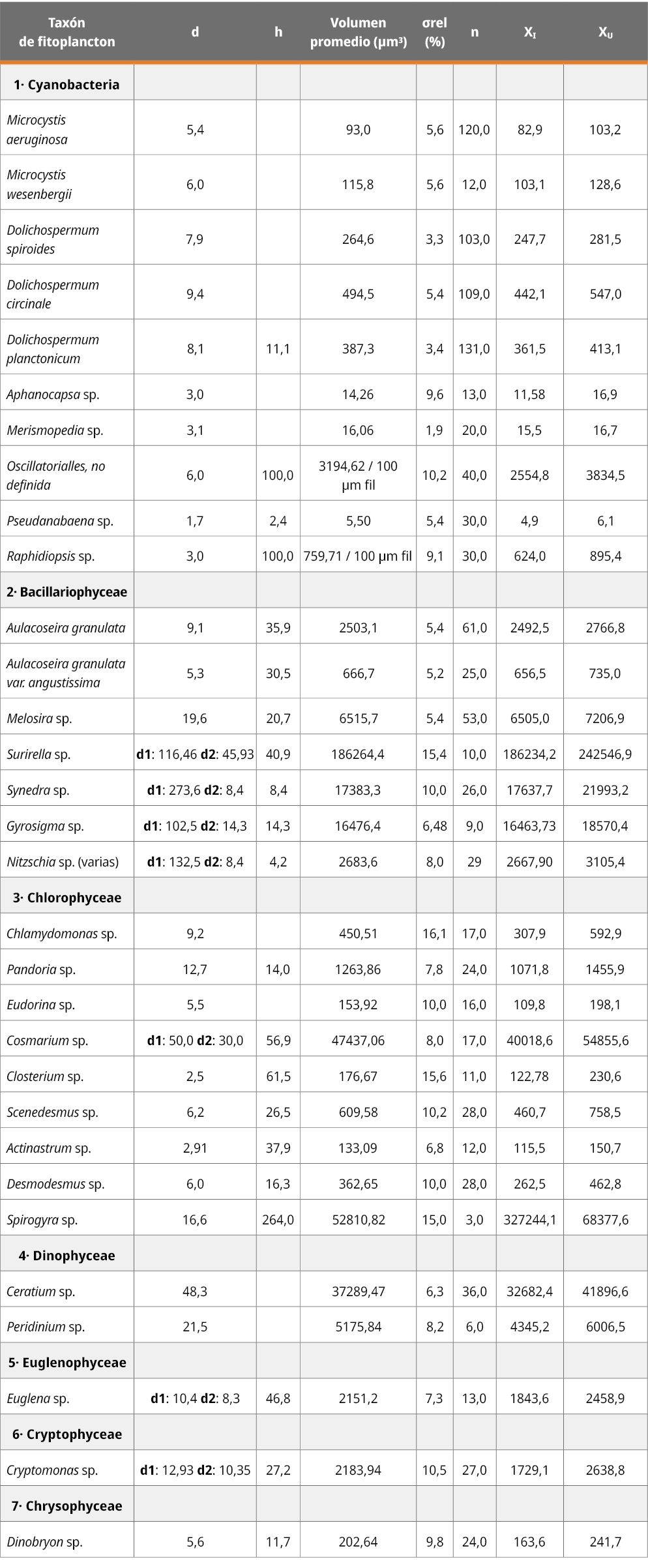 Tabla 2. Resultados promedio de la estimación de la biomasa, expresados en unidades de volumen celular (µm3) obtenidos para cada taxón, error estándar porcentual según la Norma (≤10 %), cantidad de células/individuos medidos (n) e intervalo de confianza.