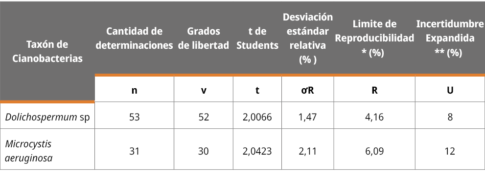 El límite de reproducibilidad intralaboratorio fue calculado de acuerdo a lo definido en la Norma 5725-6:1994 (International Organization for Standarization, 1994), apartado 4; de la siguiente forma: R = t * √2 * σR, en donde t es el valor de Student de dos colas con ѵ (grados de libertad) igual a 30 para los datos obtenidos para Microcystis aeruginosa y,ѵ = 52 para Dolichospermum sp.; con un nivel de confianza del 95 % y la desviación estándar relativa medida bajo las condiciones de reproducibilidad (σR) para Microcystis aeruginosa y Dolichospermum sp. Por otro lado, la incertidumbre expandida U fue calculada como el múltiplo de la reproducibilidad por un factor de cobertura K = 2, con un nivel del 95 % de confianza de acuerdo a lo establecido en la Norma ISO 21748:2017 (International Organization for Standarization, 2017b), en su apartado 6.1 y 6.2.