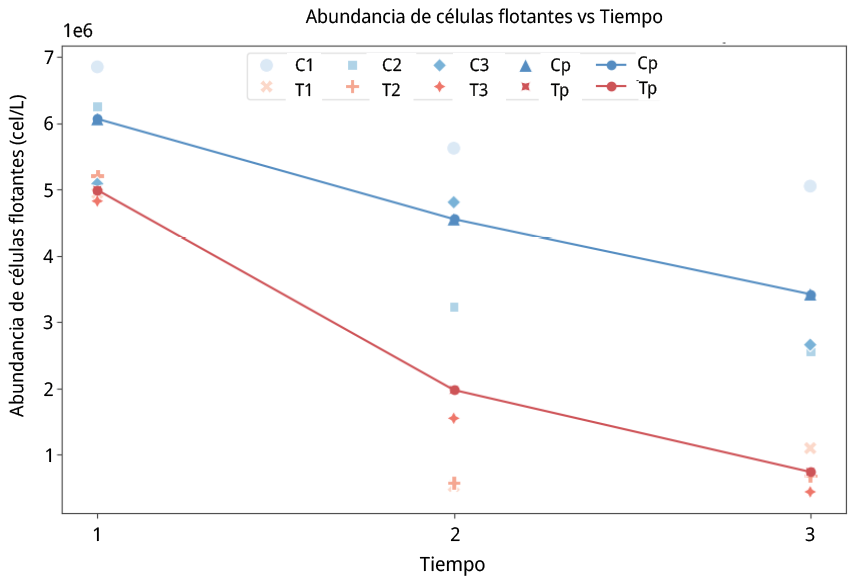 Figura 8. Ensayo ESR. Abundancia de células flotantes en valores x 106 cel/L vs tiempo.C1: muestra control de la réplica 1. C2: muestra control de la réplica 2. C3: muestra control de la réplica 3. Cp: promedio de muestras control para las tres réplicas. T1: muestra tratamiento de la réplica 1. T2: muestra tratamiento de la réplica 2. T3: muestra tratamiento de la réplica 3. Tp: promedio de muestras tratamiento para las tres réplicas (C1–T1, C2–T2, C3–T3).