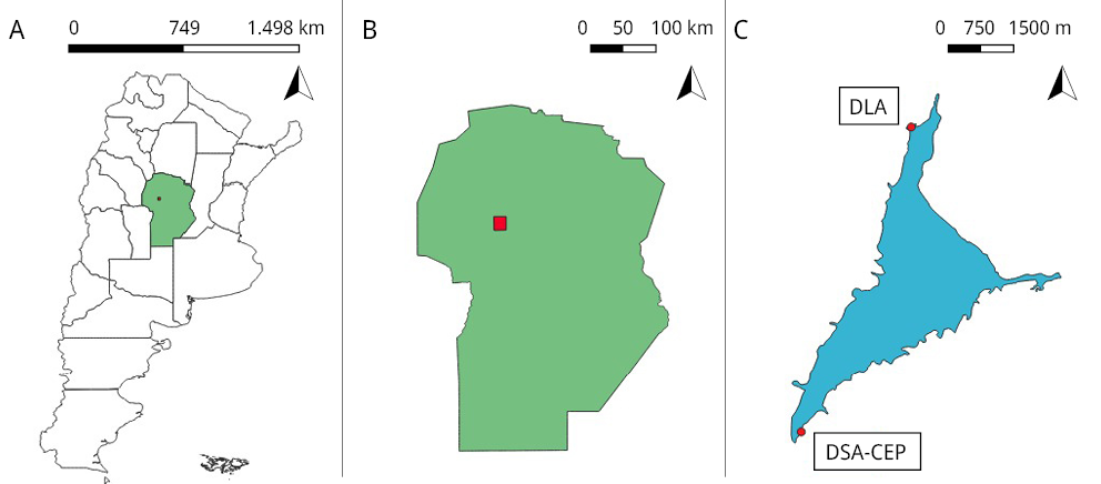 Figura 1. Puntos de muestreo de cianobacterias en el ESR. A) Mapa de Argentina resaltando la Provincia de Córdoba. B) Provincia de Córdoba, en rojo localización del ESR. C) Puntos de muestreo del ESR. DLA: Desembocadura Las Mojarras (31°20’14.8”S 64°28’10.7”W). DSA-CEP: Desembocadura San Antonio, Cuerpo Especial de Policía (31°24’47.9”S 64°29’47.9”W).