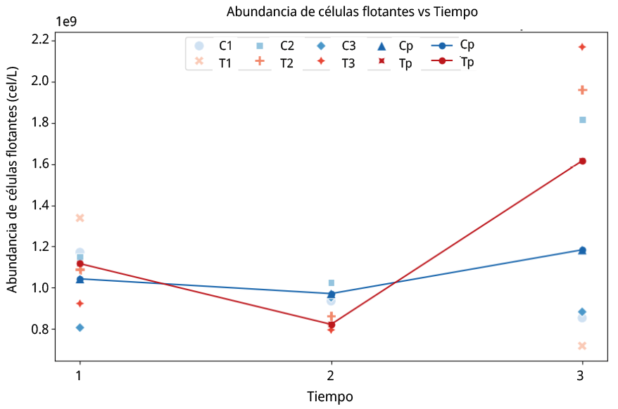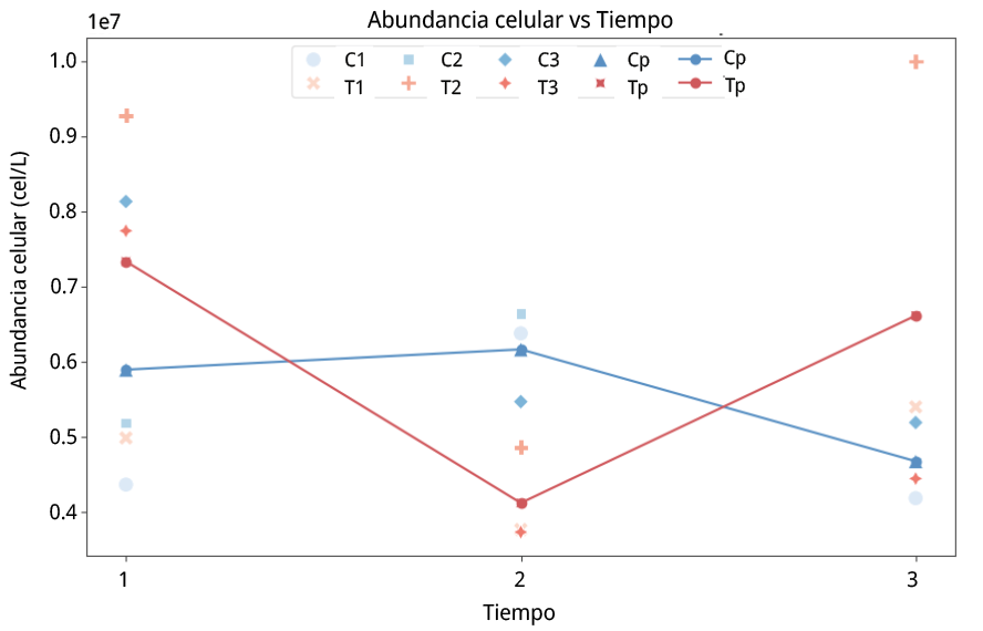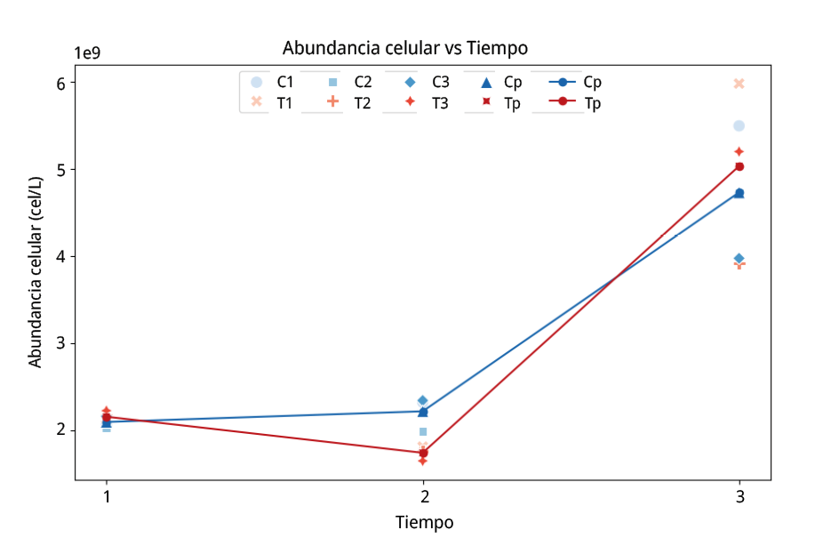 Figura 4. Ensayo de cultivo puro. Abundancia celular en valores x 109 cel/L vs tiempo. C1: muestra control de la réplica 1. C2: muestra control de la réplica 2. C3: muestra control de la réplica 3. Cp: promedio de muestras control para las tres réplicas. T1: muestra tratamiento de la réplica 1. T2: muestra tratamiento de la réplica 2. T3: muestra el tratamiento de la réplica 3. Tp: promedio de muestras tratamiento para las tres réplicas (C1–T1, C2–T2, C3–T3).