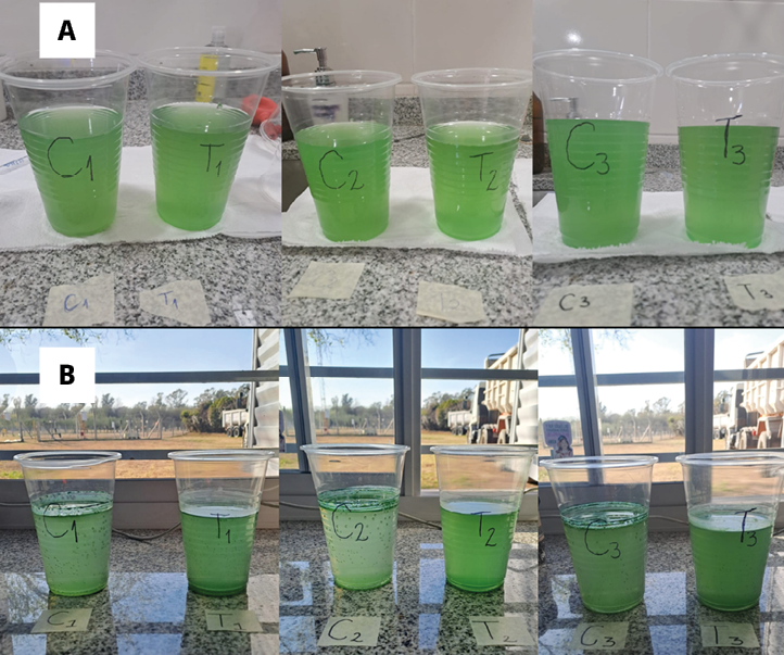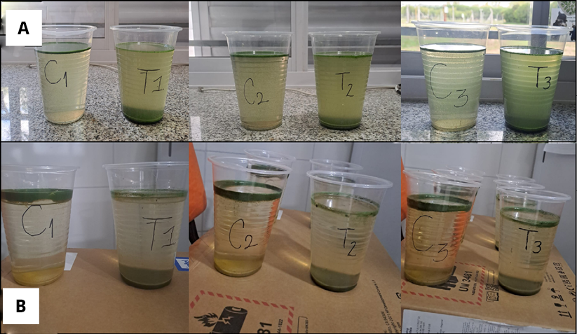 Figura 3. Ensayo de cultivo puro. Imágenes macroscópicas de flotabilidad en el control C y tratamiento T para las tres réplicas (C1–T1, C2–T2, C3–T3). A) Tiempo 2. B) Tiempo 3.