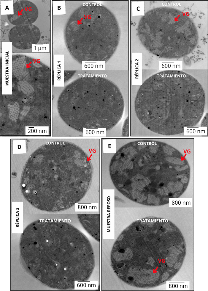 Figura 5. Imágenes de microscopía electrónica de transmisión (MET) de Microcystis sp. de cultivos puros. Vesículas de gas (VG), señaladas con flechas rojas. Células tratadas, con vesículas colapsadas. A) Muestra inicial. Escalas: 1 μm (arriba) y 200 nm (abajo). B) Réplica 1: comparación entre células control y tratadas. Escalas: 600 nm. C) Réplica 2: comparación entre células control y tratadas. Escalas: 600 nm. (D) Réplica 3: comparación entre células control y tratadas. Escalas: 600 nm (arriba) y 800 nm (abajo). (E) Muestra de reposo: comparación entre células control y tratadas. Escalas: 800 nm.