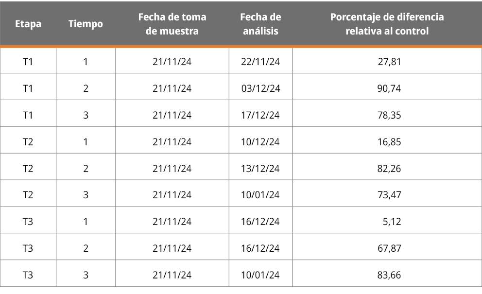 El ANOVA para la abundancia de flotabilidad en el ensayo ESR mostró efectos significativos tanto del tiempo (F (2,12) = 25,45, p < 0,001) como de la condición experimental (F (1,12) = 34,72, p < 0,001). La interacción entre tiempo y condición experimental no fue significativa (F (2,12) = 3,25, p = 0,074), aunque el valor de p se aproximó al umbral de significancia (0,05). La prueba de Tukey evidenció que el tratamiento en los tiempos t2 y t3 presentaron una reducción marcada de la abundancia celular y estadísticamente significativa, frente al control en t1 y t3. El control en t1, t2 y t3 mostró variaciones menores, con una única diferencia significativa entre control en t1 y control en t3.