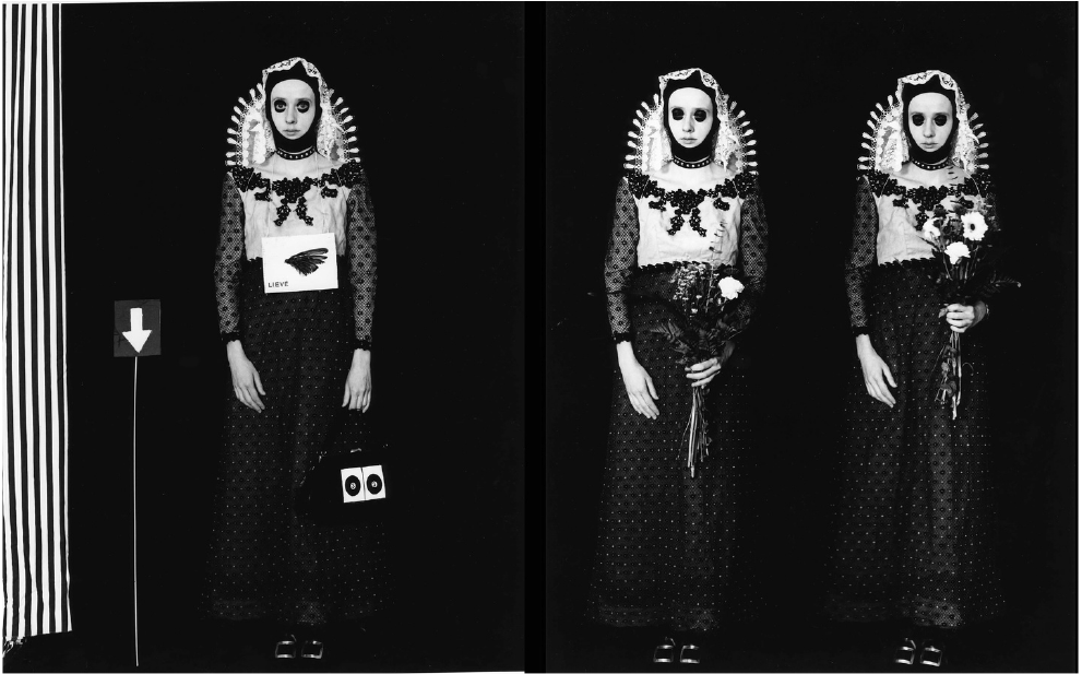 A protagonista da fotografia “Lady lazarus # 1” (representada pela própria Eyre)23. usa uma maquilhagem muito carregada, contrastando os olhos pintados de negro e o rosto de um branco imaculado, numa pose muito teatral e elaborada: “(...) acting out her own death (...).”24 O olhar é aberto, gelado e fixo, através do qual “she has managed to be the witness of the event”,25 sugerindo que o seu corpo serve também uma subjectividade que não a sua. O vestido longo de tule, os adereços das roupas, os acessórios decorativos (como os colares) a colocação das mãos, a pose, tudo é meticulosamente disposto, aludindo a um cerimonial,26 a um ritual da morte. Como aponta Vaughan : “(…) the artist could pass for a dressed-up corpse”.27 Existem dois elementos básicos na construção da fotografia: a figura da protagonista, que é o elemento mais vísivel e que está incrustada num décor muito negro, sugerindo a ideia da dissolução dos limites do corpo num espaço infinito,28 e o elemento subtil, que é dado através de pormenores, não sendo estes, no entanto, menos importantes, pois são essenciais na construção da linguagem referencial própria de Eyre e servem como pistas de decifração da “secret language that vacillates between wanting to reveal its meanings and wanting to hold them close”. 29 A mala de menina que tem numa das mãos remete para o mundo da infância e para um mundo imaginário que espoleta uma série de idiossincrasias (suas e dos espectadores) que impõem uma dimensão secreta e intíma, anulando uma leitura factual e literal do seu trabalho. A própria Eyre comenta: “So in a certain sense I have given myself the opportunity of inventing something. I hope that when people look at my work they might also have the chance of inventing their own history”.30 O sinal e o padrão geométrico na margem esquerda da fotografia introduzem um certo “non-sense” e desmontam toda a construção previamente elaborada, desviando o foco da percepção do espectador “as well as suggesting the presence of an external producer (in the case the artist herself) who, while shooting the scene that she herself has constructed and of which she is the protagonist, also feels its improbability, its lack of sense”. 31 Esta desconstrução leva-nos, por um lado, à questão da identidade e da auto-consciência32 e, por outro, à reflexão das relações do artista com a obra de arte e da obra de arte com o espectador, explorando o papel/ motivação do artista na manipulação de significados culturais, sociais e políticos.33