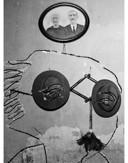 Several of Barros’ fotoformas contain visual references to these unmodernized, vernacular spaces.34 The previously mentioned Homenagem à Stravinsky is a photograph of a pair of hats and a duster hanging from a rack on a wall of discolored and peeling paint (Img. 2).35 Above these every-day housewares hangs a vernacular photograph of an older couple in an oval picture frame. Portraits in this style—bust-length, often hand-colored photographs featuring a straight-faced, austerely-dressed, older couple standing side-by-side—were, and still are, very typical of lower-middle class Brazilian homes. Below the portraits hangs a small glass bottle. Superimposed on this banal still life, Barros etched in drypoint and traced in Indian ink the figure of an older man using the hanging hats as eyes, and the duster as nose and mustache. The combination of Barros’ primitive drawing style, the lowly objects that make up the composition, and the home’s apparent state of disrepair allude to a lower-class occupancy. Importantly, there is a direct correlation between the fotoformas that employ plebeian iconography, those that most bluntly display artistic intervention through Barros’ application of crude caricature-like sketches, and the those with the least architectonic iconography. fotoformas in the vein of Homenagem à Stravinsky are constructed compositions as are other, more structured fotoformas, but with a much different aesthetic result, suggesting Barros’ recognition that the São Paulo cityscape was a melange of official and precarious modes of construction.