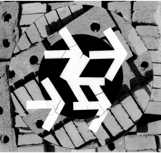 Fotoforma (Img 4), also 1949, repeats the spiraling motion of Abstracto. However, instead of creating Fotoforma from overlapping exposures with limited control over the final image, Barros composed the image in his lab from a single negative that was cut and remounted on glass. The artist mechanically incised two inscribed circles on a photographic negative depicting bricks. He turned the first circle approximately 135 degrees counter-clockwise, so that the bricks met at jarring angles. By contrast, he completely discarded the second circle, leaving a gaping central void. Over the top of the cut-up negative Barros arranged five arrows made from an opaque material. After development, the arrows appear as stark white symbols superimposed on the photographic background. The precise lines of the artist-generated shapes—both the arrows and the circles—echo the geometricity of the bricks, formed with circular spaces in their cores for encasing rebar reinforcement. However, while the photographed bricks display some variation and nonuniformity, the artist-added shapes are unnaturally precise.