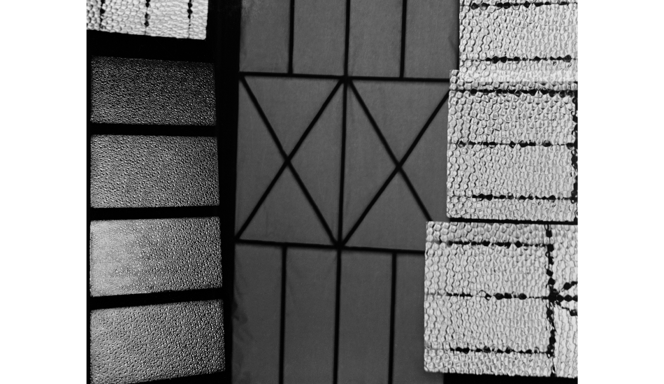 The telephone wire fotoforma has further significance as a photograph whose composition unifies the disparate visual elements in the room. Barros’ worms-eye view of the wires mimics the visual rhythm of two multiple-exposure fotoformas made from overlaid exposures of a partially opened door, flanking his straight photograph. The utility pole’s shape also resonates with a photograph across the room of a chair whose gridded seat mimics the grid of the wires. Together these geometric photographs reinforce the organizing grid-structure of the exhibition space. The solids and voids of the wires are echoed in the solids and voids of Barros’ exhibition panels, as are their greyscale palette. The geometric minimalism of the images and the room communicates the artist’s modernist proclivities, while alluding that, like the city itself, the fotoformas are a work in progress. The room buzzes and hums with synchronous, analogous patterns rooted in the urban.