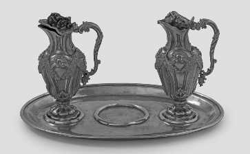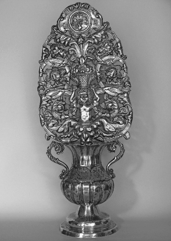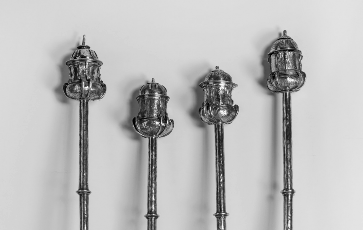 Consisten en una base a manera de jarrón, en la cual están dispuestas las placas cinceladas, a imitación de un ramo de flores, cuyas inscripciones indican que estaban dedicadas a San Pedro y San Juan. Estas obras evidencian el alto nivel alcanzado en las técnicas de cincelado, repujado, calado y martillado, y a su vez da una idea del grado de representatividad que tenía la plata en el ámbito religioso. A pesar de la innegable abundancia de flora del territorio de la Nueva Granada, en este caso se “reemplazan” las flores naturales por una ornamentación labrada en plata, acompañada por un elemento simbólico potente como la cariátide14 central, de rasgos angélicos, cuyo significado celestial hace trascender la pieza de una función de ornato a una discursiva.15