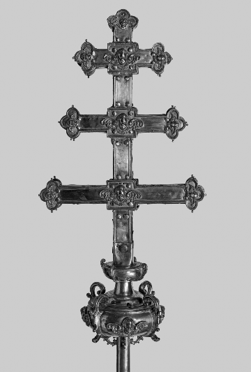 Las cruces procesionales servían para preceder al celebrante en las acciones litúrgicas40, cuya representación jerárquica corresponde a la cantidad de travesaños: la sencilla, de significación cristológica; la de dos travesaños representa el poder arzobispal y la de tres travesaños el poder papal (Img. 12).