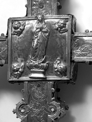 Una de las características de la cruz procesional era el hecho de tener dos caras, igualmente ornamentadas y con iconografías complementarias, para que pudiera seguirse admirando una vez pasara el cortejo procesional. Así, en una de las cruces estudiadas (Img. 13), puede verse la complementariedad que la imagen de María tenía con la de Cristo, pareja devocional fundamental en la evangelización americana. Cabe anotar que la procesión no era simplemente una actividad religiosa, o exclusiva de los miembros más destacados del orden colonial; el recorrido procesional era realizado por todos y cada uno de los miembros de la sociedad, agrupados de acuerdo a su corporación de pertenencia. Era en sí misma la réplica de la vida diaria en un evento religioso público; dado que los espectadores también eran protagonistas, el hecho de que las cruces procesionales fueran igualmente comunicativas por sus dos caras, cobra sentido.