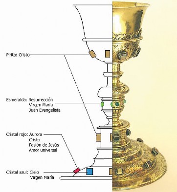 Otros de los materiales ampliamente utilizados en la platería neogranadina son las piedras preciosas. En el repertorio neogranadino, están presentes principalmente la esmeralda, la amatista, el topacio y el diamante, además de las perlas. Su engaste resulta más frecuente en custodias y cálices. A pesar delsentido cristológico de su uso, también es frecuente la presencia de piedras con simbolismo mariano. Tal es el caso de un cáliz perteneciente a la colección del Museo de Colonial, engastado con piritas, esmeraldas y cristales de color azul y rojo. En la Imagen 14 se muestra la ubicación de las mismas en la composición y su significado; si bien prima la simbología cristológica, la representación mariana también está presente para manifestar esa pareja sagrada tan común en tierras americanas: Cristo en María.