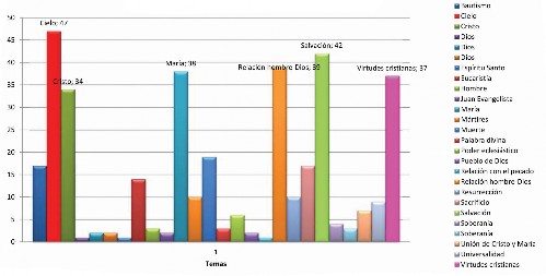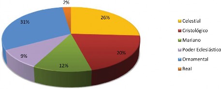 Estos 98 simbolismos se clasificaron en 26 temas principales. En la Gráfica 3 se aprecia que las temáticas más recurrentes son: la referencia al cielo como el Reino de Dios, que reúne el 47% de los elementos iconográficos; la salvación por Cristo, (42%); el modelo mariano de santidad (38% de los casos), la expresión de las virtudes cristianas (37%) y las figuras de principio cristológico (34%). Estos seis son los temas más importantes de la iconología orfebre neogranadina del período virreinal.