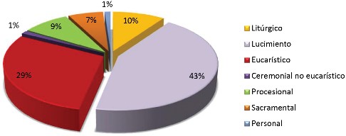 De las menciones de los documentos de archivo sobre la importancia del lucimiento de las imágenes religiosas, es posible inferir que las ideas iconodúlicas habían calado profundamente la cotidianidad religiosa de los fieles neogranadinos. La prioridad del culto a las imágenes y reliquias de los santos se puede confirmar a partir del análisis de los artefactos. En la Gráfica 1 se muestra que el 43% de las piezas analizadas estaban destinadas al lucimiento de imágenes. En segundo lugar, por cantidad, se identifican los artefactos de uso eucarístico, seguidos por los artefactos con fines litúrgicos, los procesionales, los sacramentales y, finalmente, los de uso ceremonial no eucarístico ni sacramental y los accesorios de uso personal. Ello indica que el reconocimiento público a partir del lucimiento de las imágenes y el culto a la sagrada forma fueron los dos elementos devocionales más potentes como motores de la demanda y la producción de obras de platería en la Nueva Granada virreinal.