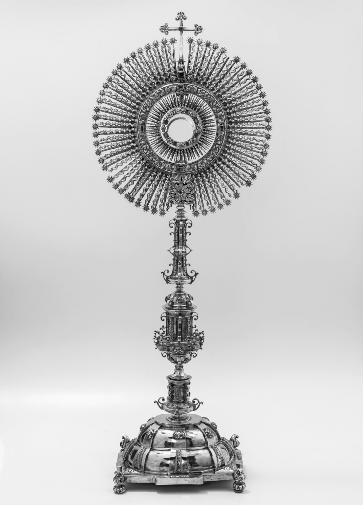 La veneración a la sagrada forma y al vino eucarístico fue de tal importancia que se le dio relevancia capital a la fiesta del Corpus Christi, sin duda la más importante del año y cuya procesión era el espacio por excelencia para la manifestación de las jerarquías sociales. Este evento, de costumbre extendida por todos los reinos americanos, dio lugar a ricas custodias portátiles de tipo solar.23 Al parecer, desde mediados del siglo XVI se expidieron cédulas reales para que la exposición del Santísimo Sacramento (hostia consagrada) se hiciese con la dignidad correspondiente y para que los templos fuesen dotados con los elementos requeridos para el culto divino24, de cuya permanente solicitud dan cuenta numerosos documentos escritos del período virreinal pertenecientes al fondo Fábrica de Iglesias del AGN.