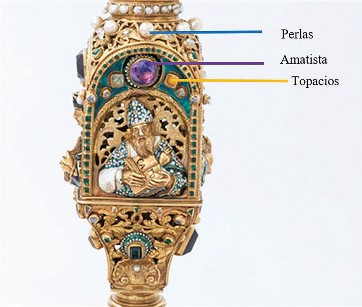 Además de las custodias, los artefactos que intervenían en el momento de la consagración jugaban un papel fundamental en el proyecto de evangelización a través de la imagen. Los cálices tienen como característica común el uso del baño de oro, bien sea en la totalidad de la pieza o, como mínimo, en la parte interna de la copa;27 esta práctica, además de su función de proteger la pieza contra la oxidación, tiene un profundo sentido simbólico, toda vez que el oro es el material que representa el principio cristológico por excelencia. Aunque en menor medida, también hacen presencia las perlas y otras piedras preciosas engastadas, cuyo significado se relaciona con el clero secular y las comunidades religiosas. Por ejemplo, en La Preciosa hay algunos topacios ubicados bajo las figuras eclesiásticas del vástago, que representan el poder sacerdotal, al tiempo que la amatista y las perlas tienen una acepción cristológica (Img. 6).