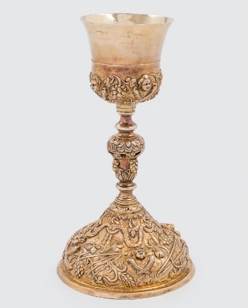 Uno de los cálices más representativos del sacrificio eucarístico es el perteneciente a la Catedral de Bogotá, que tiene una impecable decoración cincelada, con los elementos simbólicos de la crucifixión (Img. 7) —los clavos, la escalera, la esponja y la lanza—,considerada “el momento fundamental del sacrificio pactado con sangre, a partir del cual se alcanza la redención de los hombres”28. Salta a la vista la potencia comunicativa de este cáliz, que prueba cómo los discursos católicos permearon la propia producción estética y técnica de los artífices plateros, quienes lograron por este medio posicionarse como una ocupación con reconocimiento social.