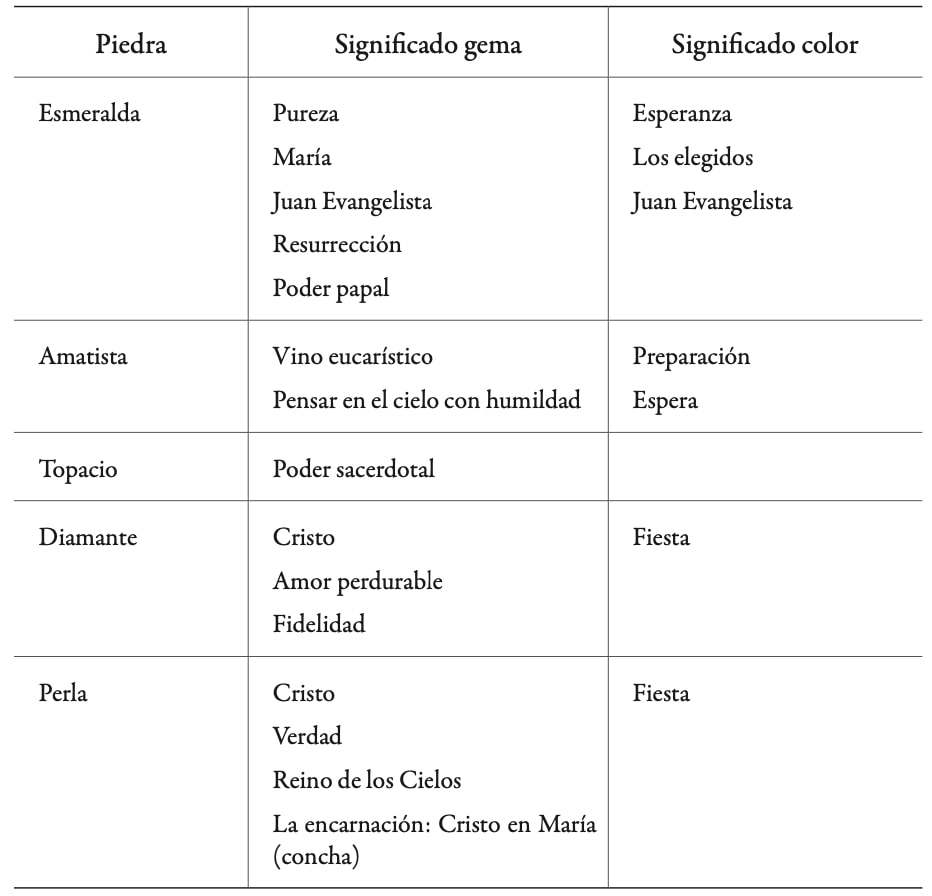Si bien, en la tradición antigua y medieval de los lapidarios, las piedras se consideran portadoras de propiedades mágicas, la iconología católica las utilizó para reafirmar su discurso. La proliferación de esmeraldas en lugares cercanos, facilitó a los plateros santafereños el acceso a esta piedra, cuyos significados eran la pureza, la castidad, María y Juan Evangelista.46 En la Tabla 1 se señala el significado de las piedras preciosas encontradas en las colecciones estudiadas, de acuerdo a la simbología de color y material del estudio de Lurker sobre la tradición bíblica.Como se constata a partir de su iconología, tanto los metales como las piedras preciosas pueden leerse en la platería neogranadina como componentes semánticos que forman parte de la aceptación del discurso eclesiástico; el material complementó las dimensiones funcionales y estilísticas de los artefactos, de manera que se logró una integralidad simbólica para promover el encargo de un repertorio objetual coherente con el contexto social del siglo XVIII.