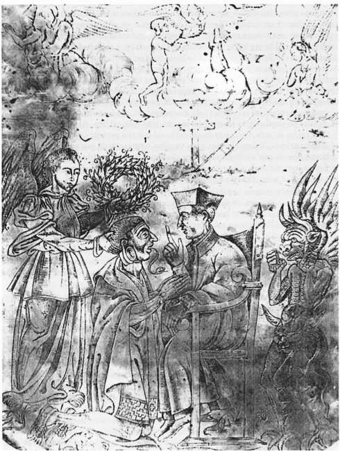 Esta estrategia de materializar el pecado o el mal en un objeto específico, también tiene su paralelo en una de las pocas imágenes que representa al sacra- mento de la confesión en territorio americano. (Img. 2). Se trata de una plancha grabada en cobre realizada entre 1588 y 1615 y que debió servir como molde a un elevado número de estampas que seguramente se repartían entre la población indígena con ocasión de misiones de evangelización jesuitas.38 En una composición de tipo jerárquico, a la derecha encontramos un cura jesuita que está confesando a un indígena noble probablemente acusado de idolatría —lo sabemos porque aparece con la cabeza trasquilada, castigo que se le imponía a quienes caían en este pecado—. El indígena aparece arrodillado y en evidente estado de arrepentimiento, mientras que el confesor eleva su índice derecho en un gesto de instrucción. Otros dos personajes completan la escena: un demonio a espaldas del confesor que enfurecido demuestra haber perdido la batalla de la conciencia contra el sacerdote y un ángel que corona al penitente arrepentido en señal de triunfo por la expulsión del pecado. En la parte superior de la imagen vemos una escena celestial soportada por una cruz que sirve de vínculo entre ambos mundos y en la que se representa el alma del indígena (ahora aparece con abundante pelo como señal de que ha sido perdonado y restituida su integridad) siendo recibida por un ángel y llevada por este a su encuentro con Dios. El pecado ha sido expiado por el sacramento de la confesión, evidenciando el poder de la palabra y lo beneficioso de su uso en el proceso de extirpación de idolatrías. Con respecto a la idea de la materialización del pecado, llama la atención que este no solo se represente en la figura del demonio, sino también por medio de la pequeña serpiente que sale de la boca del indígena al momento de su confesión.