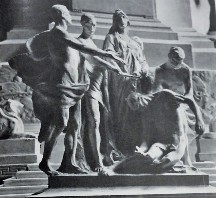 Apesar dos elogios à obra de Ximenes, os jurados solicitaram diversas mudanças à proposta inicial, como a inclusão de outros eventos históricos que completariam a narrativa do processo de independência, que no projeto estava restrito ao sete de setembro, contemplado no alto relevo, e às estátuas sedestres dos próceres. Dentre as alterações requeridas pelo júri estava a substituição das alegorias “Jugo e a escravidão” e “Liberdade” por grupos escultóricos que representariam os inconfidentes mineiros (Img. 8) e os revoltosos de Pernambuco (Img. 9). Essas rebeliões haviam acontecido no período colonial e se caracterizaram por defender a ruptura com Portugal e a adoção do regime republicano, ideias que se ajustavam aos valores que um monumento erguido durante a República pretendia reforçar. Houve também a inclusão de baixos relevos representando a aclamação de D. Pedro I como imperador em São Paulo e o Combate do Pirajá, batalha final do processo de independência, ocorrido na Bahia. Por fim, a estátua sedestre de Tiradentes foi substituída pela de Hipólito José da Costa, já que aquele havia sido contemplado em um dos conjuntos laterais. Essas inclusões evidenciavam as intenções memorialísticas dos jurados e promotores do concurso A solicitação de mudanças em projetos vencedores de concursos não era algo incomum,55 mas é um indicativo de que os motivos para a escolha de um projeto não se restringiam à composição.