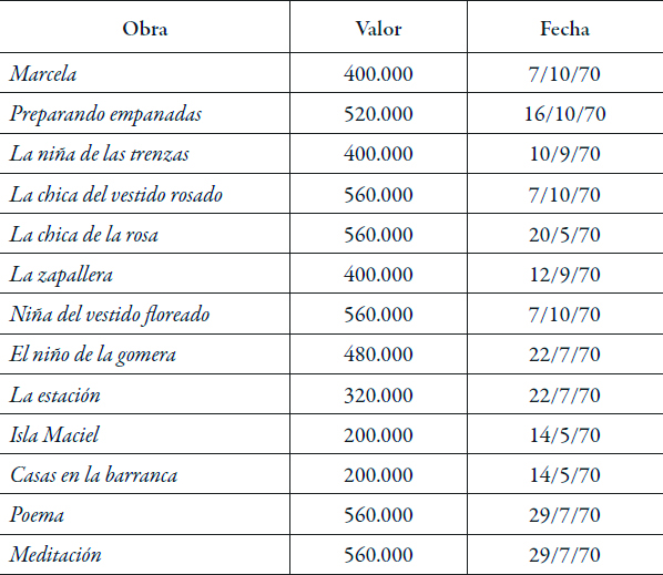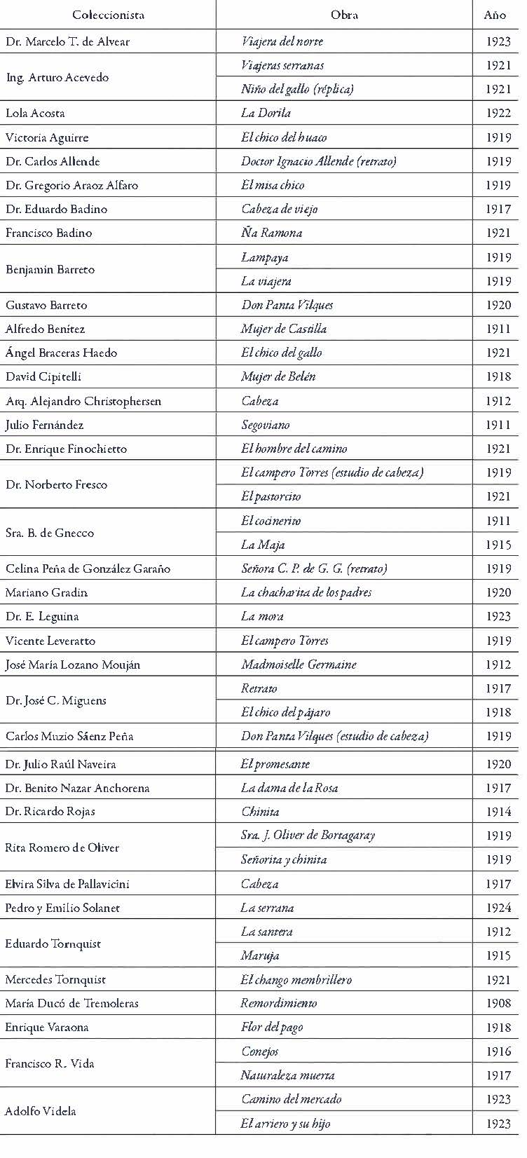 La trayectoria de Bermúdez terminó de manera súbita. En 1924 se radicó en Granada tras asumir el cargo de cónsul del gobierno argentino; dos años después falleció. Casi de inmediato, la Comisión Nacional organizó una muestra en Buenos Aires a modo de homenaje en la que se expuso el conjunto de obras más amplio hasta ese momento. Además de varias reproducciones de obras y de un ensayo firmado por Cupertino del Campo, el catálogo tiene un listado detallado de las pinturas expuestas en el que se consignan las colecciones a las que pertenecen. Resulta llamativo que, fuera de las siete obras pertenecientes a museos públicos y las veintisiete que figuraban como propiedad de la viuda del artista, el resto de las cuarenta y seis pinturas hayan sido prestadas por coleccionistas privados. El siguiente cuadro recupera los nombres de las obras y sus respectivos dueños. (Ver tabla página siguiente.)
