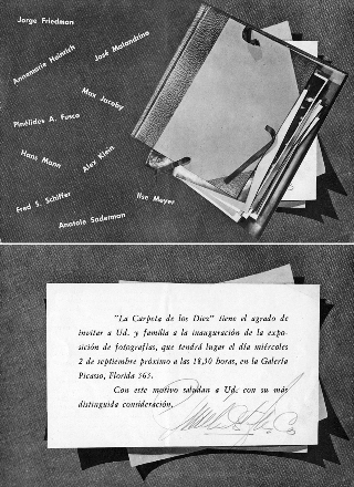 Cada exposición contaba con una invitación impresa en donde se especificaban los nombres de los miembros que participarían, junto a otros datos sobre la inauguración (Img. 3). Sobre las seis exposiciones realizadas es posible encontrar notas de diferentes extensiones y profundidad de análisis en importantes medios gráficos del país, lo cual remarca la importancia que tuvieron en su momento estos eventos. Observando las fotografías publicadas en aquellos medios que cubrieron las diferentes actividades de La Carpeta podemos aproximarnos a una idea del tipo de imágenes exhibidas, que en algunos casos eran sumamente experimentales mientras en otros correspondían a clásicas imágenes documentales o retratos de estudio. Asimismo, el grupo como tal decidía cómo y dónde serían sus exposiciones, qué fotografías participarían y cómo estarían dispuestas.