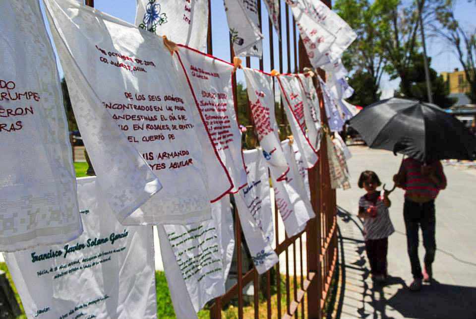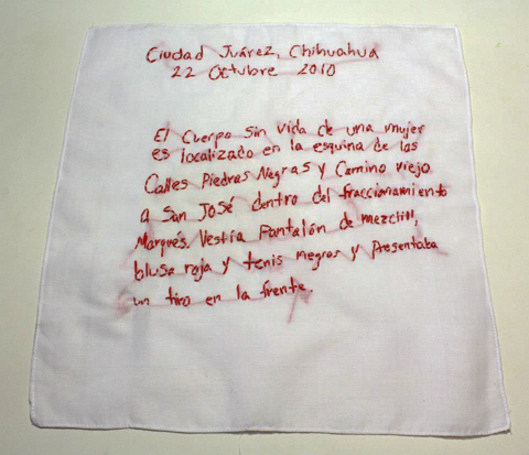 In Mexico, the roots of Bordeamos por la Paz’s political embroidery project are generally traced to the organization Fuentes Rojas in Mexico City, a civic group that originally formed to dye public fountains red as a protest against violence. In time, some of the women in the group began creating embroidered handkerchiefs as protest, an initiative they dubbed “Embroidering For Peace” or, in some formulations, “Embroidering for Peace and Memory.” 10 In 2011, this group began embroidering factual accounts of homicide, generally taken from newspaper stories, using red thread on a white handkerchief. Each handkerchief typically represents one victim. From Mexico City, the embroidery-as-protest project spread to other cities suffering high rates of violence, with various independent groups adopting the process. The visual iconography of the project expanded to include not only victims of murder and violence, but also the many disappeared people, who were represented with green thread.