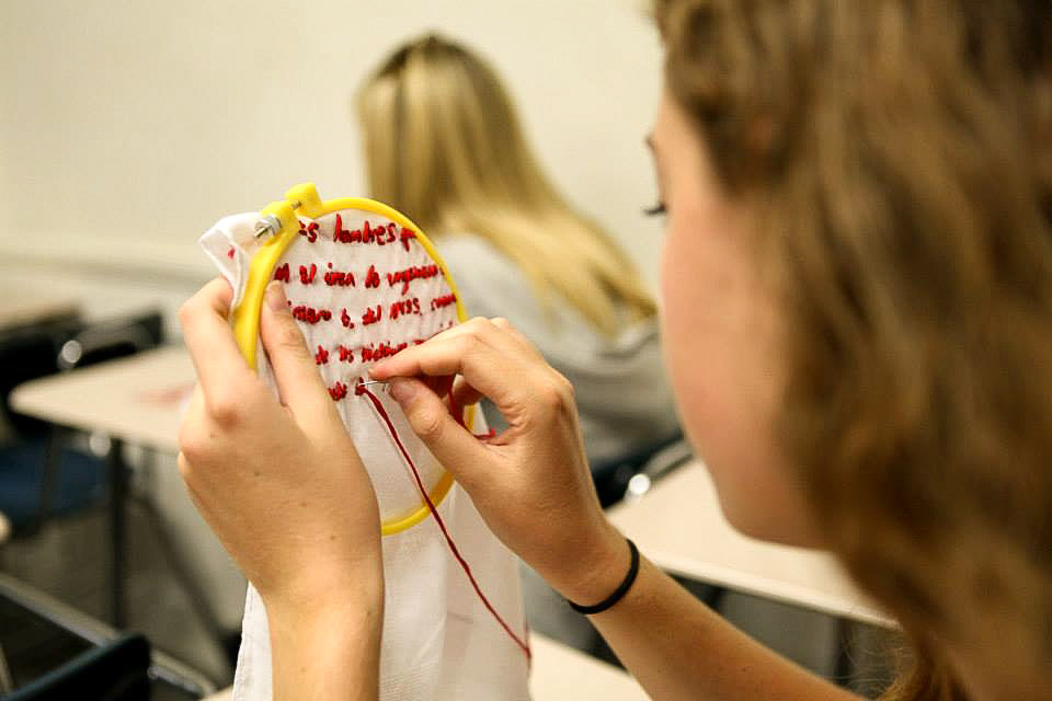 Second, a defining characteristic of neoliberalism is the element and rhetoric of competition as inherent to political structures and human relations. 29 The emphasis on competition associated with neoliberalism has resulted in a denigration of the collective, manifesting in anti-union sentiment and the increased privatization and marketization of social institutions, from healthcare to education. Within colleges and universities, these values are visible in policies such as a frequent preference for increased tuition combined with financial aid, which defines education as a private good and puts students in competition with each other for access. 30 In examining social problems, adherents of neoliberalism often place blame solely on individuals and downplay or deny the role that social and economic structures play in framing their choices and opportunities. There is a certain “looking out for Number One” attitude associated with the individualism and competition of neoliberalism. A CESL project that takes on Bordeamos as a partner would fundamentally be about counter-acting individualist and competitive tendencies through a collective act of solidarity and a participatory sharing in the suffering of others, even when that suffering is construed to be “their fault.” Embroidering encourages a physical experience with collective activism, which creates a form of embodied knowledge. The physical process of making is a primary method of obtaining knowledge in the classroom.