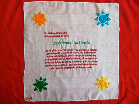 At the end of the semester, I shipped the finished handkerchiefs back to Magda, and she photographed them for inclusion in the photographic record of Bordeamos. The handkerchiefs were also included in public displays in Juárez.