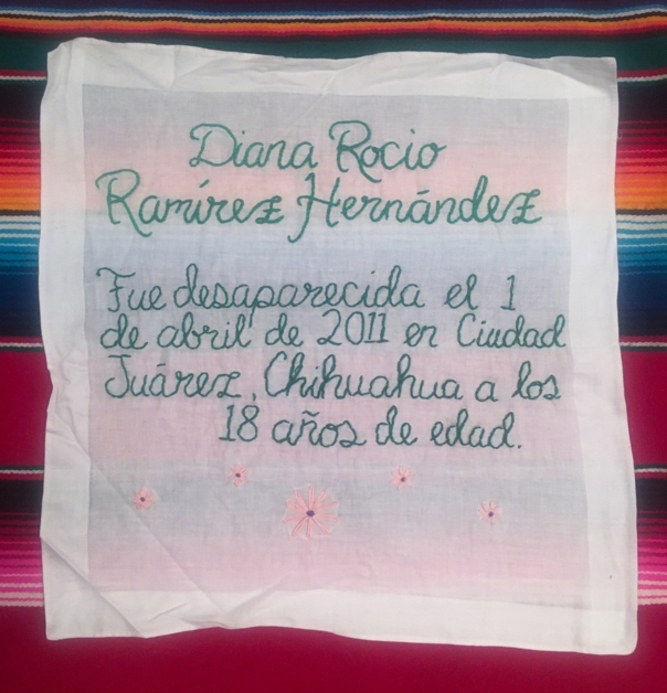 The implementation of the service learning project in US classrooms helped relieve some of Bordeamos’s workload. The collective’s goal is to embroider one handkerchief for each victim, a monumental and, unfortunately, never-ending task. In 2014, we embroidered stories of deaths that occurred four to six years earlier, and yet more victims were and are being added to Juárez’s death toll daily. Although the Adopta a unx Desaparacidx project was more focused on individual cases, the project’s goal had an international focus, and Bordeamos had already welcomed participation from groups in the United States, Japan, France, and the Netherlands. Our own participation added to this growing international visibility, and they were able to promote the project on virtual platforms without taking time and resources away from their ongoing work, which was vital as Bordeamos is entirely volunteer based.