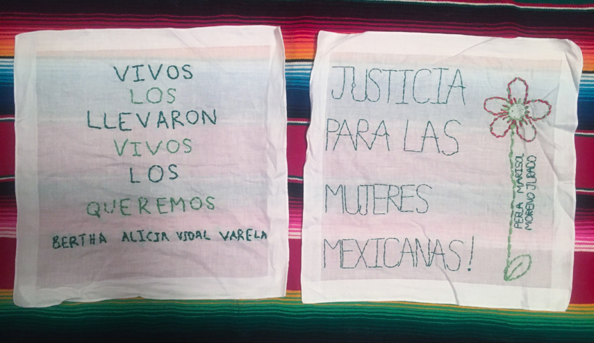 The solidarity among those willing to pick up a handkerchief and embroider one story at a time has spread beyond Mexico’s borders. The craft is a way for people worldwide to express their empathy and their “being with” victims of violence. Often, international volunteers receive the stories from Mexico, embroider them on handkerchiefs, and then ship these back to be displayed in a Mexican city. Sometimes, however, particular stories are deliberately kept out of their localcontext. Hazel says that for reasons of security, or to protect the identities of families, some stories containing sensitive details are sent to be embroidered by collaborators elsewhere. These handkerchiefs are not returned to Juárez, but are displayed in that other location.