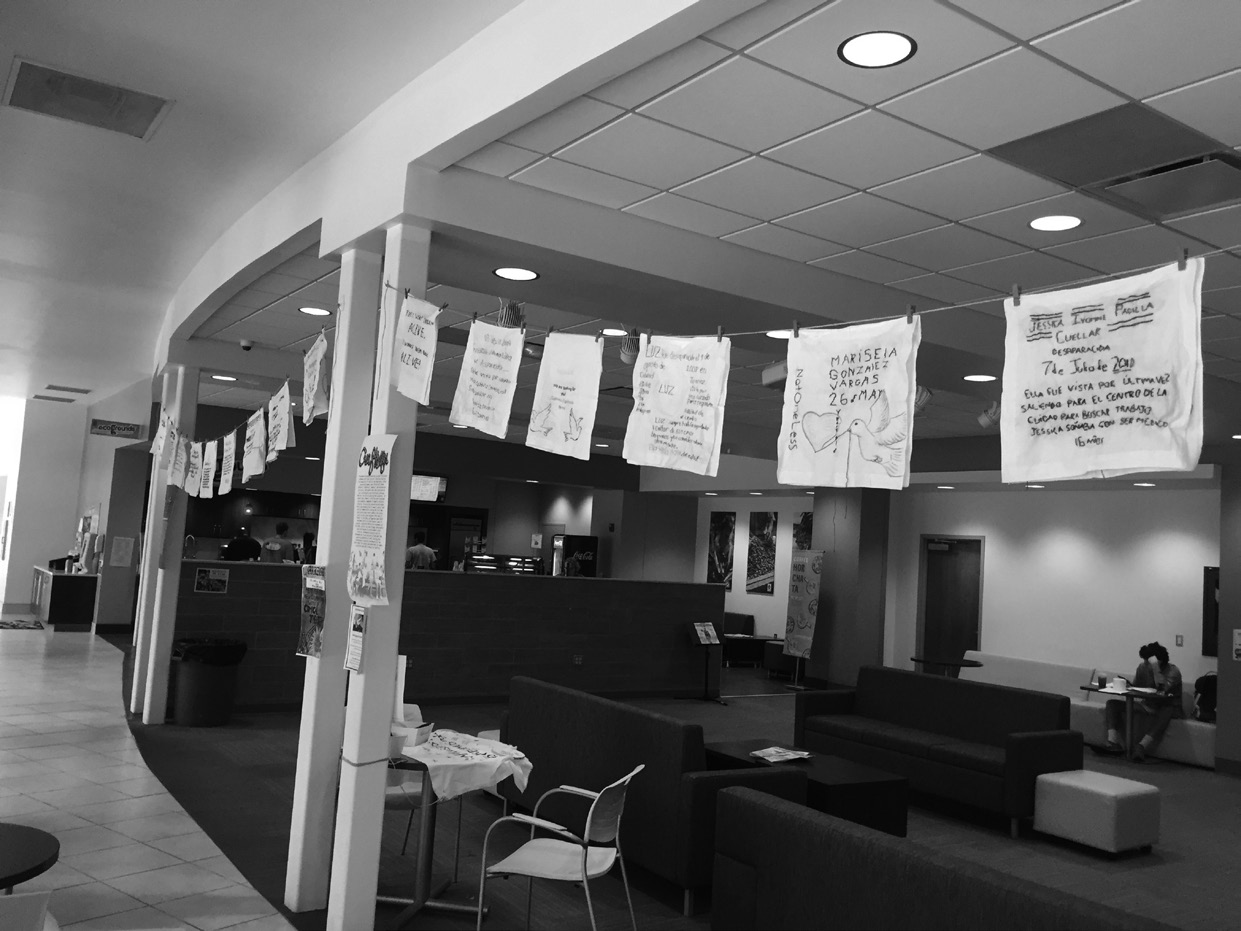 Of course, the projects were not without their faults. As discussed above, the act of embroidering in public spaces is an essential characteristic of the various embroidery groups throughout Mexico. In retrospect, we believe the service learning intervention could have had additional impact if we had more intentionally imitated the practice of embroidering in public. For example, Boudreaux’s classes met weekly outside of regular class time to embroider together, but this meeting took place within a closed classroom. At an individual level, some student embroiderers reported they had engaged in conversation about the project and the victims with people who observed them embroidering. There could be additional power, though, in arranging embroidery sessions in the public spaces of the university campus. Although McCutcheon’s class executed a final public installation of their works, embroidering in public spaces would have generated a greater amount of visibility for the project as well as accessed this key component of its creation. There may be a benefit in selecting strategic locations that will access a variety of populations on and off campus (for example, not only embroidering in the library, cafeteria, or gym spaces, but also in spaces downtown), or, conversely, in choosing one select location and time to generate visibility and a reputation for the repeated weekly practice of embroidering that other people might join in on. Appearing in public would likely attract curious onlookers, and the students would have more opportunities to engage in outreach and consciousness-raising while answering questions about their work. Embroidering in public would also better match the spirit and practices of the original collectives in Mexico.
