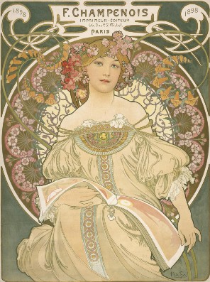 Mucha, an exponent of Art Nouveau, uses color in his illustrations, mainly soft pastels, while Beardsley typically sticks to a black and white atmosphere. Another important difference can be found in their approach to the human figure. Although both artists display a sensuous style, Beardsley’s characters are enigmatic and hidden-like, while in Mucha we usually find more ethereal compositions with “fairytale” women at the center of the piece, as in in F. Champenois (1898) or the Monaco–Monte Carlo poster (1897).34 Mucha’s scenes, as his women, are more idealistic, while Beardsley’s usually present a glimpse of his torments and passions. As a result, Mucha’s stylized female figures bear none of the bawdiness that gives Beardsley’s their additional magnetism.35