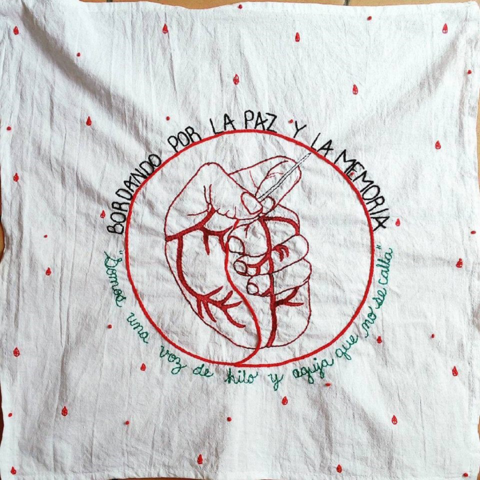 Las bordadoras de los colectivos de Bordando por la Paz bordan los nombres de los desaparecidos, a veces sus caras o las circunstancias de su desaparición. También ocupan la superficie como un espacio de expresión visual. Más que un reclamo o un espacio para hacer visible un caso el bordado de los pañuelos es una respuesta a duelos brutales, inesperados, complicados de vivir tranquilamente. Muchas veces no hay cuerpo que llorar, muchas veces el trabajo de la justicia es borroso y opaco. Estas acciones retoman los códigos tradicionales y universales del bordado: su íntima relación con la muerte, el lenguaje, la memoria. La relación entre la tela y la muerte es importante en todas las culturas: nace de la necesidad de envolver el cadáver para absorber los fluidos que siguen circulando, contener el proceso de descomposición y, por supuesto, evitar al ojo el espectáculo temido del cuerpo en putrefacción. La tela es el primer marcador de la integración del ser humano en una comunidad (el pañal que envuelve al recién nacido) y es también su último contacto con el mundo (el sudario, reemplazado en la época contemporánea por el acolchado suave del interior del ataúd; la ropa, último homenaje y acompañante del ser humano en su viaje hacia el más allá). Clare Hunter, en su apasionante libro sobre la complejidad de los significados que nos unen a los hilos y en particular al bordado, escribe lo siguiente acerca de la presencia de los textiles y bordados alrededor de la muerte y sus rituales: